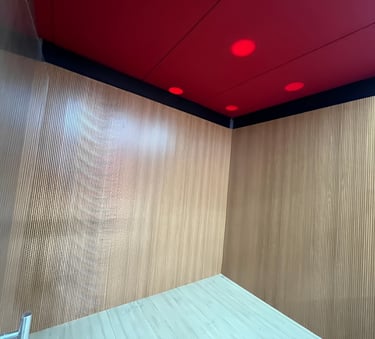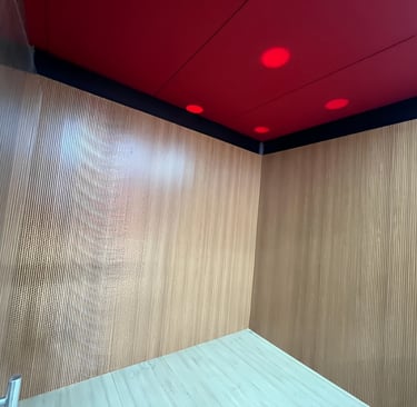 Nossos painéis acústicos de madeira perfurada aliam estética sofisticada e altíssima performance sonora. Com instalação por sistema macho e fêmea, garantem acabamento contínuo e visual impecável em paredes ou tetos — inclusive superfícies curvas.